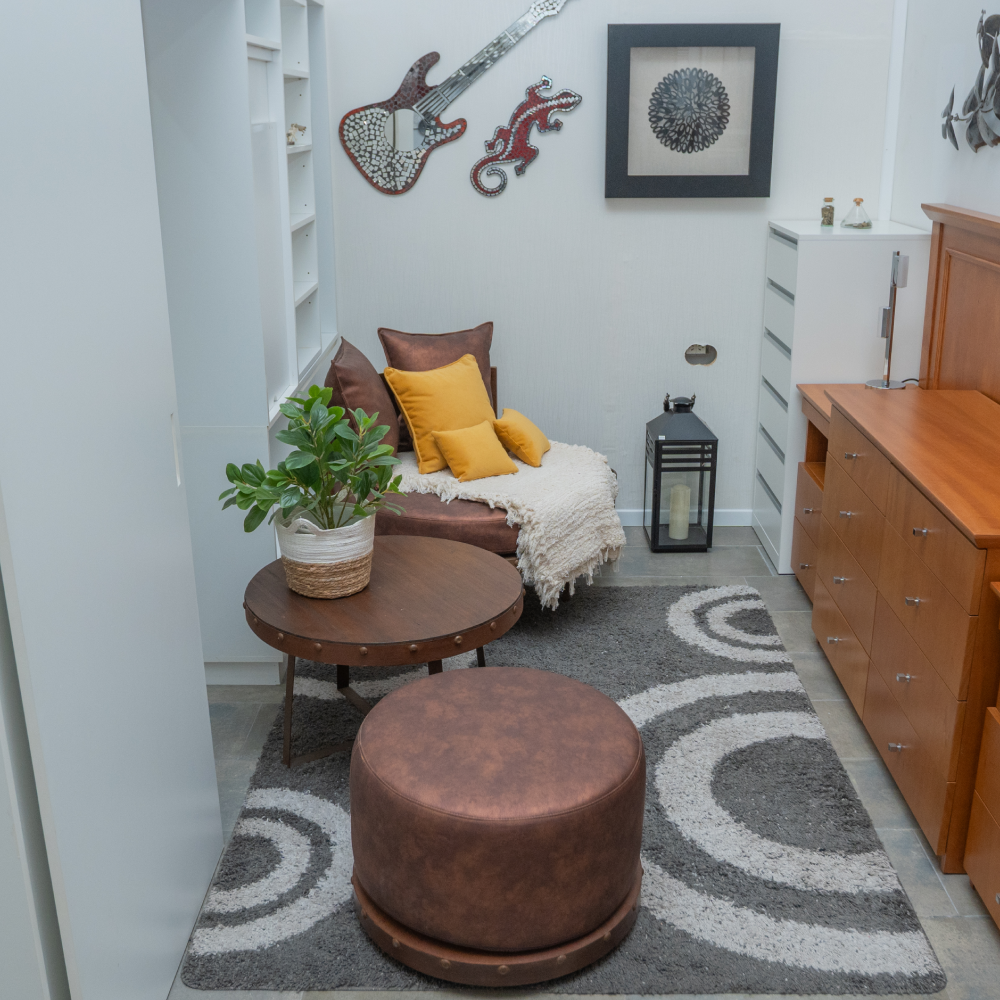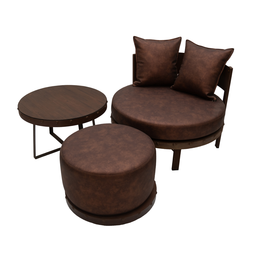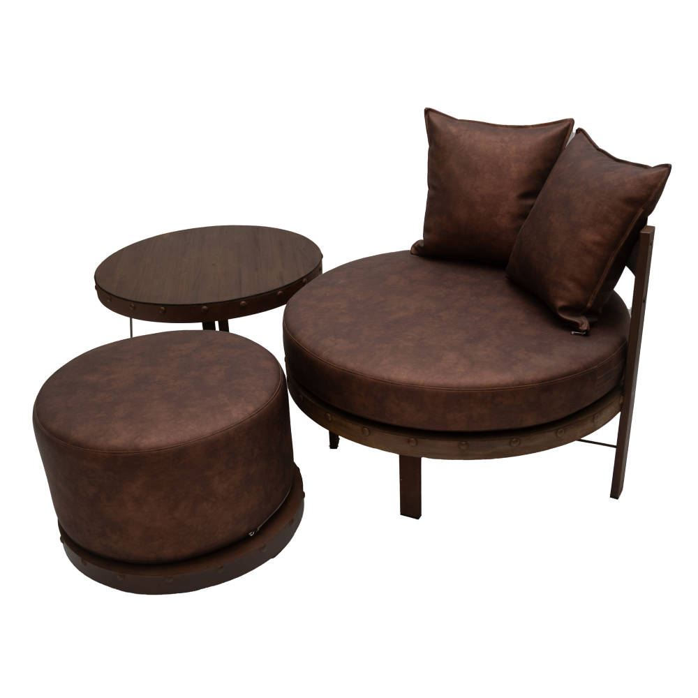 El conjunto se integra por un sillón redondo, mesa lateral y puff en juego. Esta realizado en hierro macizo combinado con madera y lleva almohadones construidos con placa maciza en super soft de alta densidad tapizados en eco cuero marrón. El equipo se completa con dos almohadones decorativos en idéntico material rellenos con vellón siliconado